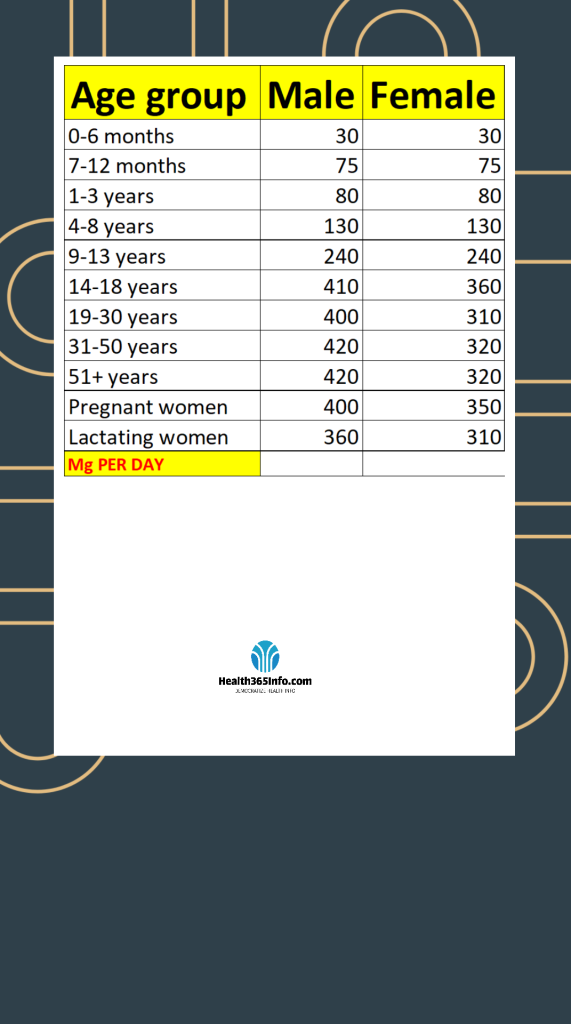 The recommended daily allowance (RDA) for magnesium can vary based on age, sex, and specific life stages or conditions. Here are the general guidelines for magnesium intake, Dosages are based on the dietary reference intakes (DRIs) issued from the Food and Nutrition Board of the United States Government’s Office of Dietary Supplements, part of the National Institutes of Health (NIH).
